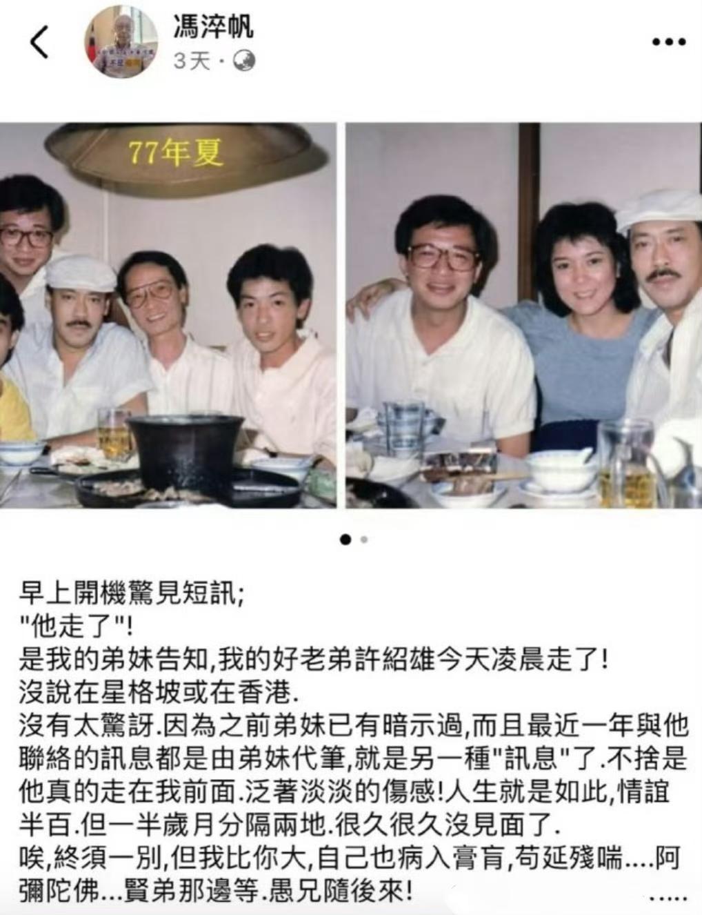 其中,曾与许绍雄私交甚笃、同样在香港娱乐圈留下深刻印记的冯淬帆,在得知老友离世的消息后,内心无比悲痛,却又似乎早有预感,坦然面对自己的时日无多,发文悼念,字里行间透露出无尽的凄凉与不舍。