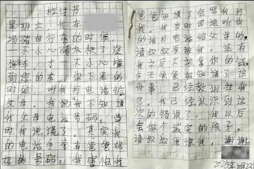 更令人感动的是,事后小男孩的父亲还带着他上门道歉,并送来了一封男孩手写的检讨书。在检讨书中,男孩写道:“我说:‘我不知道我父母的电话’,当时我说谎了……我害怕爸爸知道了会骂我打我。我已经认识到这次的错误了,我以后会做个诚实的孩子,请叔叔原谅我,谢谢。”