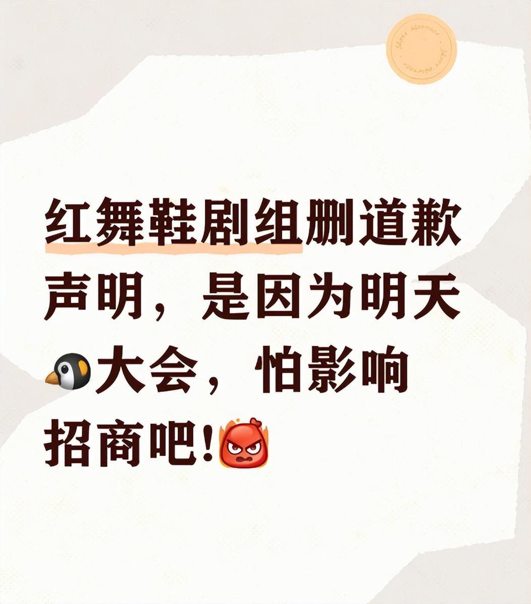 更微妙的是,剧组选择在平台招商大会前一天删除道歉声明。这一时间点引发网友猜测:剧组是担心道歉会影响招商,才选择“牺牲”道德底线?