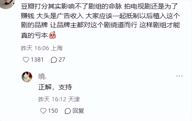 面对剧组的“操作”,网友们并未止步于打低分。有人提出更直接的抵制方式:抵制剧中的植入广告,向品牌方施压。毕竟,金主减少投入后,剧组的经费和宣发都会受影响,这才是真正拿捏住剧组命脉的手段。