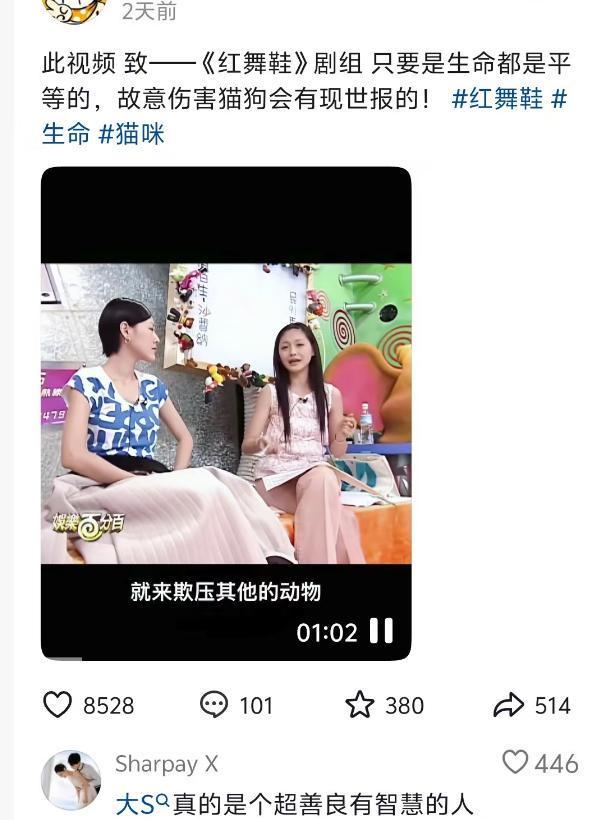 事件中,有网友搬出大S多年前的一段发言,喊话《红舞鞋》剧方和周也。当时的大S直言:“生命是平等的”,并怒斥那些轻视猫狗生命的人。