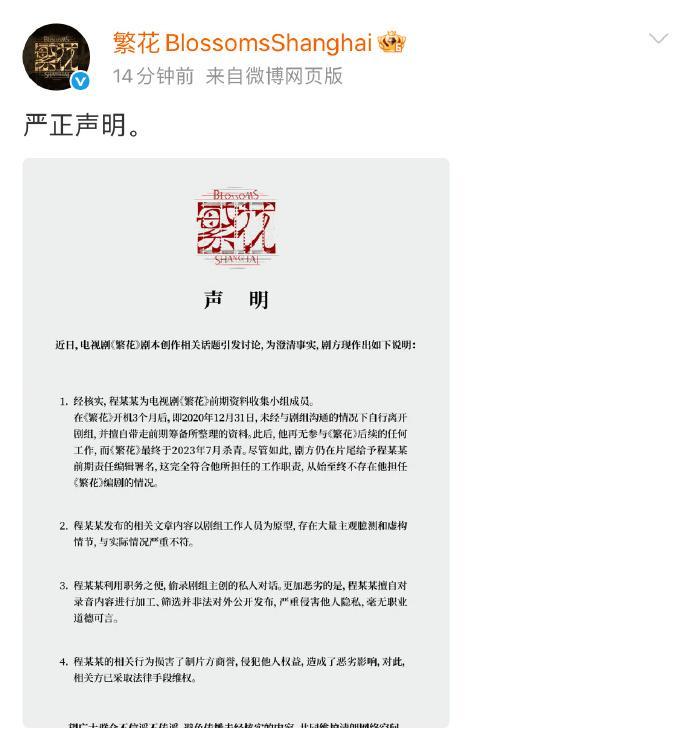 剧组澄清过后,秦雯也随时发声明,说古二造谣诽谤,还要找律师起诉他,事情越闹越大。9月,《繁花》再一次发声明,可依旧没有把舆论压下。