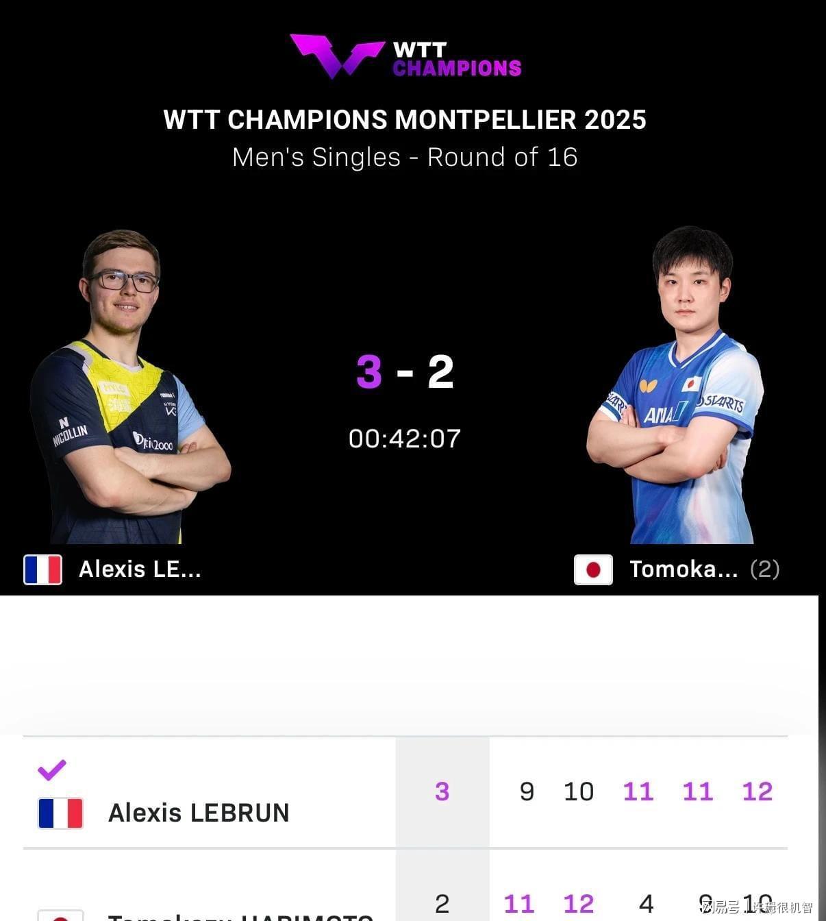 WTT冠军赛法国蒙彼利埃站上演了一场跌宕起伏的惊天逆转,世界排名第四的日本选手张本智和在手握4个赛点的绝对优势下,被主场作战的法国选手艾利克斯·勒布伦与全场沸腾的观众联手完成不可思议的翻盘,最终以2-3止步八强。