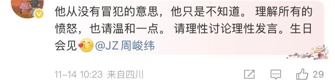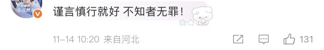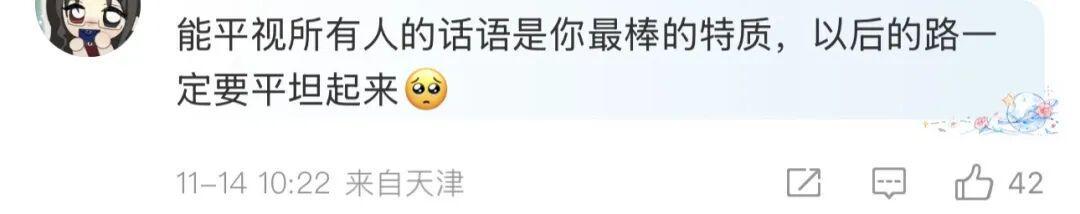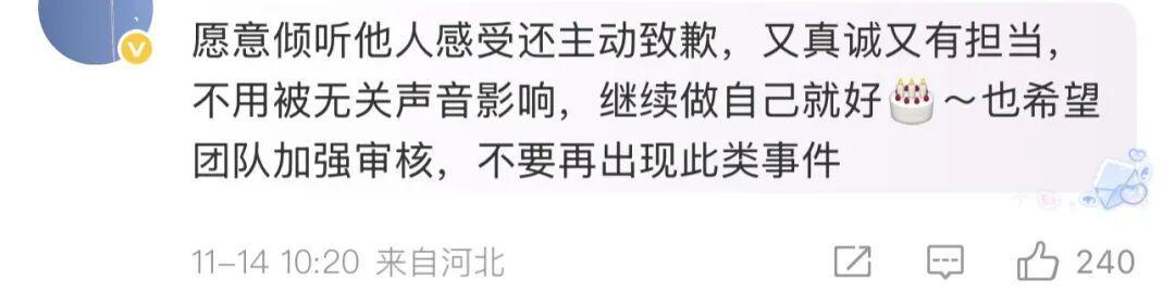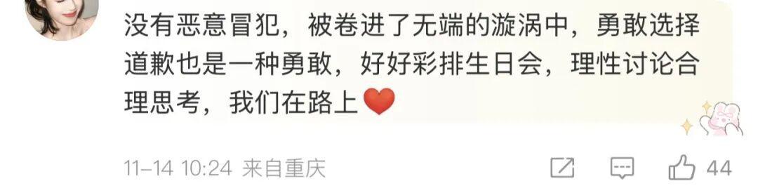 粉丝一边替他开脱“无心之失”,一边还反过来花式夸他“愿意倾听他人感受还主动致歉,又真诚又有担当”、“被卷进了无端的漩涡中,勇敢选择道歉也是一种勇敢”、“能平视所有人的话语是你最棒的特质,以后的路一定要平坦起来”。