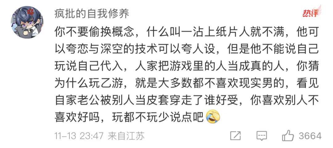 他涉足这个小众圈层前,既没有最基本的了解,也缺乏应有的敬畏;而“已婚”的身份,又偏偏撞上“代入虚拟男友”的言论,形成了双重冒犯,精准踩中了玩家社群最敏感的雷区。