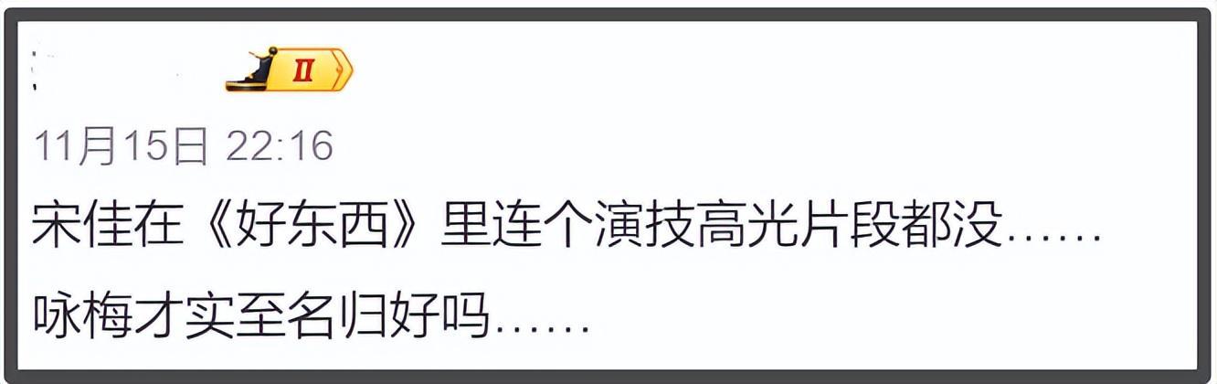 从演技的突破性到角色的丰富性,网友们普遍认为宋佳在《好东西》中的表演并不及咏梅在《出走的决心》中的精彩。更有网友指出,宋佳在该片中的高光时刻全靠台词支撑,根本没有出圈的演技片段,因此对她能够打败咏梅、二封金鸡影后表示强烈质疑。大家纷纷为咏梅鸣不平,再次对金鸡奖的公平性和含金量提出了质疑。