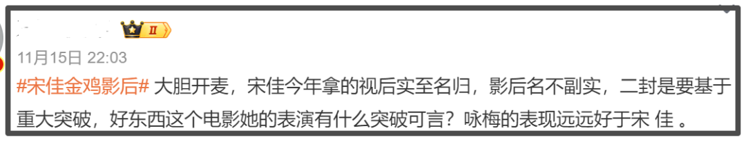 怀揣着愤愤不平的心情,激动的网友们纷纷涌向各大官方账号的评论区,表达自己的不满和质疑。首当其冲的自然是电影频道官方账号,在官方恭喜宋佳二封金鸡奖最佳女主角的动态评论区中,第一条评论就是质疑金鸡奖太水了,认为明明有更优秀的女演员同台竞技,但奖偏偏给了表现略逊一筹的宋佳。此外,前排的多数评论都是在为咏梅鸣不平,直言宋佳的表演比不上咏梅。