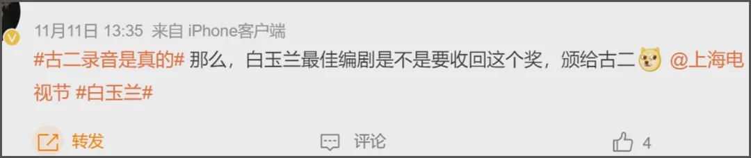 目前,网友已经开始呼吁要撤回秦雯凭借《繁花》所获的奖项,白玉兰奖的官微评论区已经彻底沦陷。古二因编剧署名问题,多次晒出会议录音,自证参与编写《繁花》剧本,并顺便曝光了编剧秦雯的各种丑事,包括打警察、找枪手、抄剧本、嘴同事等。