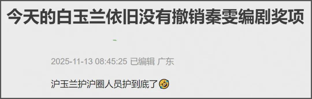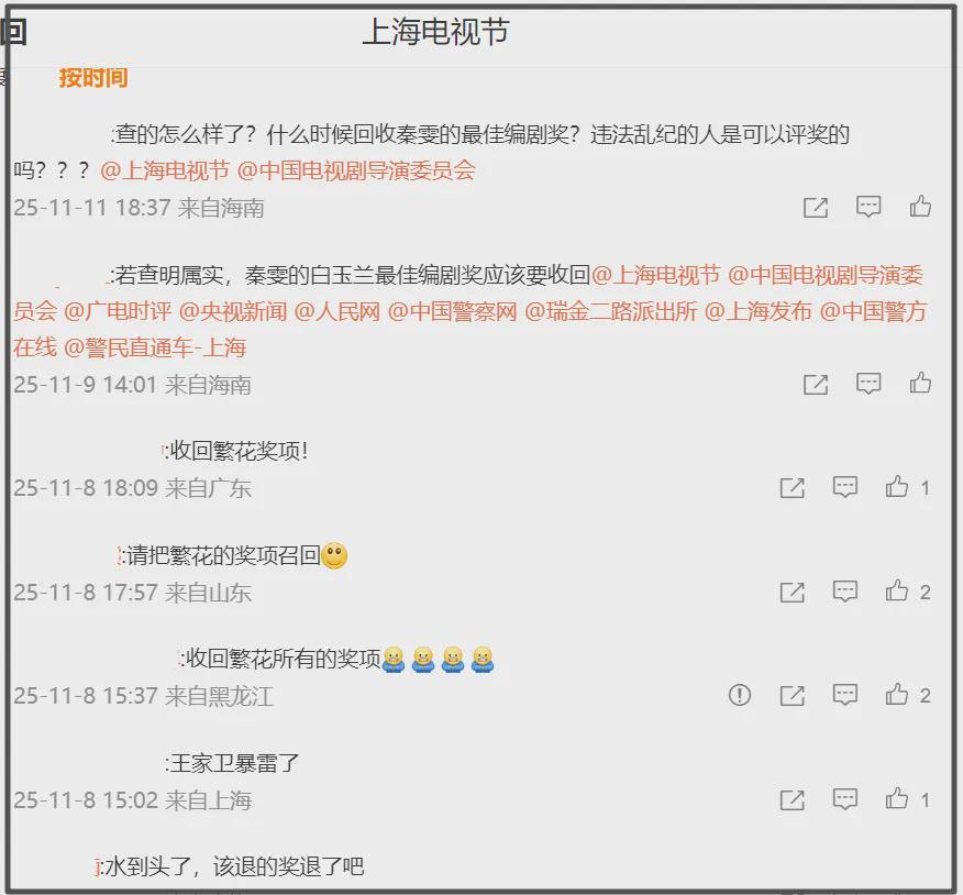 不少网友表示如果录音为真,那就表示秦雯并不是《繁花》唯一编剧,再加上她有违法劣迹,应该撤回她的相关奖项,白玉兰奖的官微评论区都沦陷了。