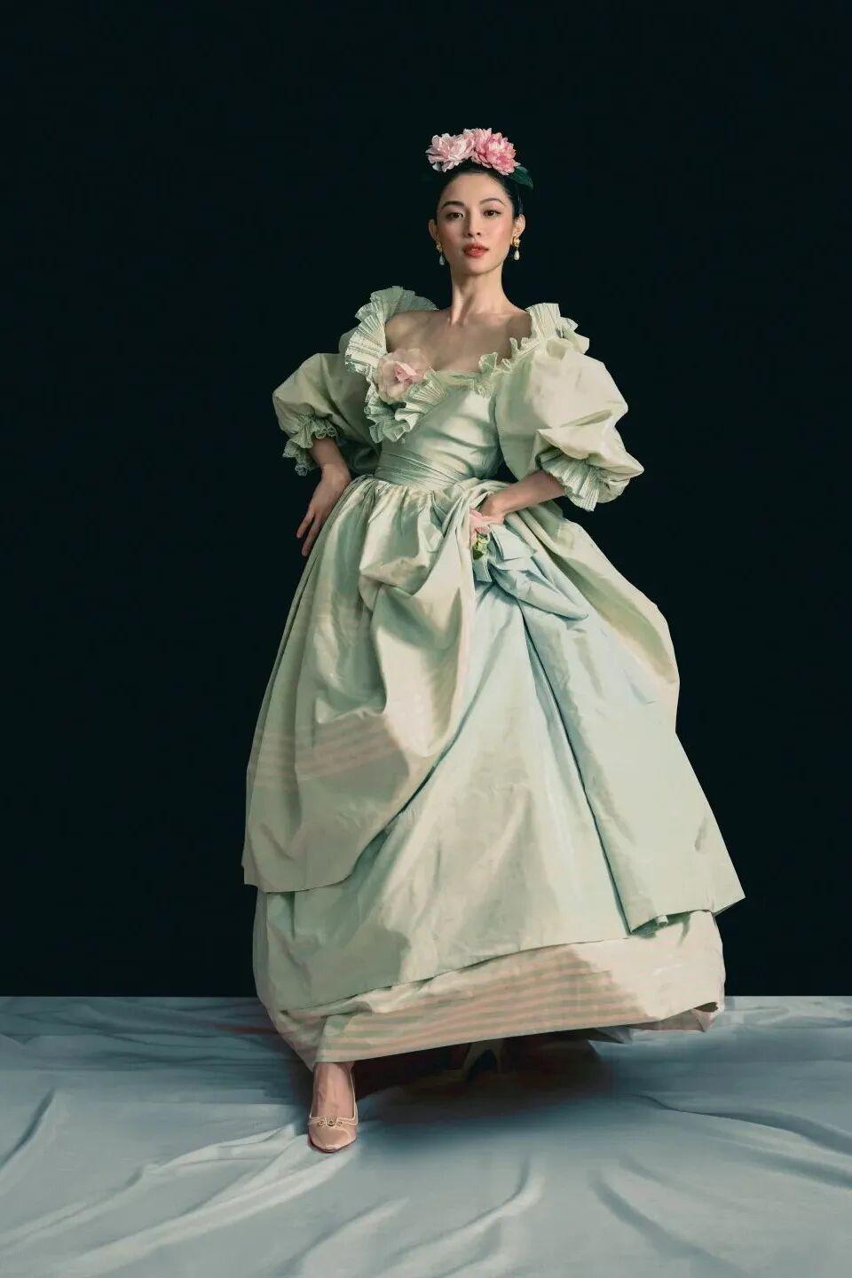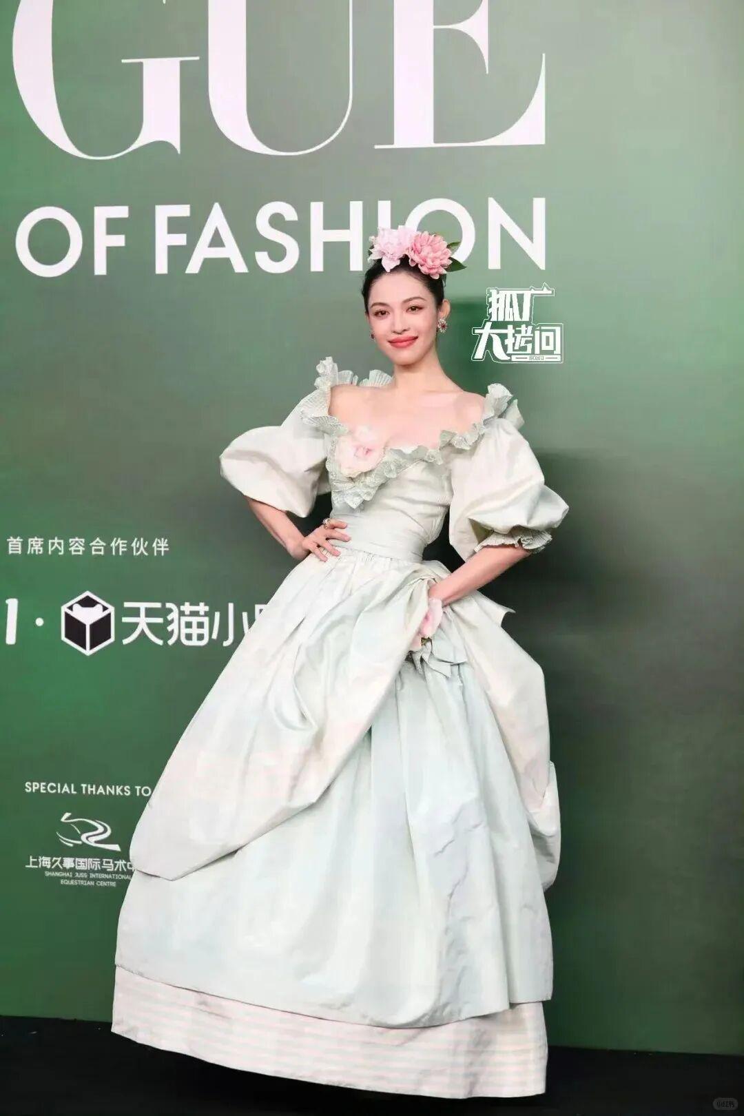 当晚,她上身法国老牌时装屋Nina Ricci 1987年的古董礼裙,荷叶边和宽大的裙摆让人梦回洛可可时代,搭配上绢花头饰和珍珠耳饰,整体造型呈现细节满满,复古气息扑面而来。