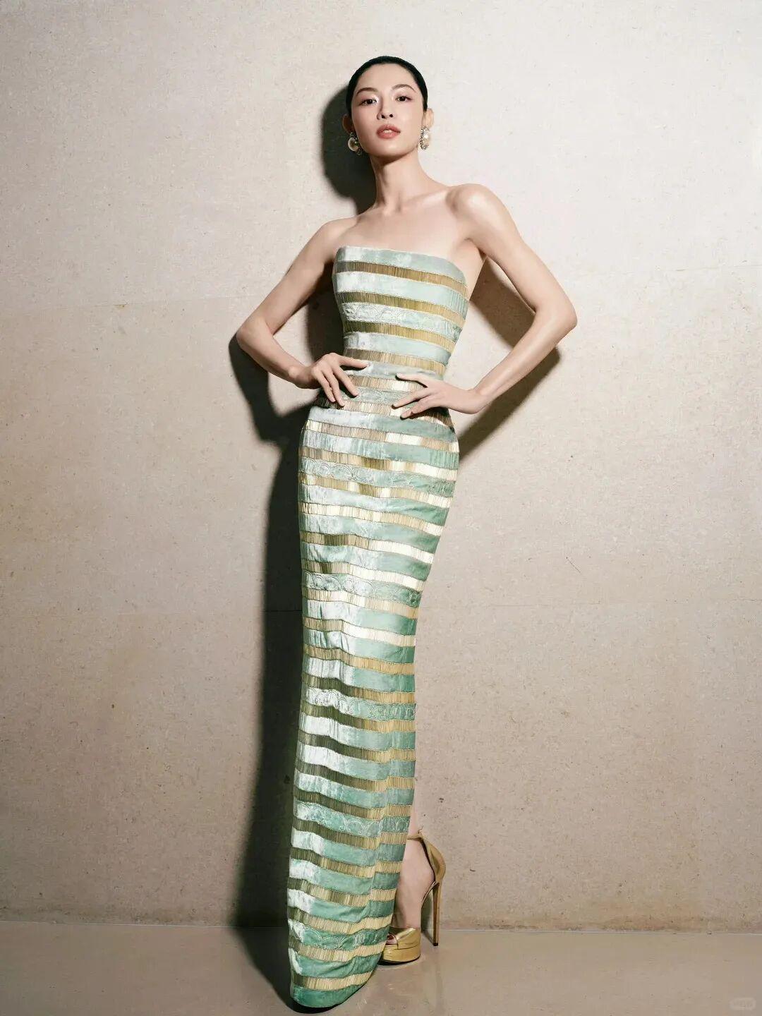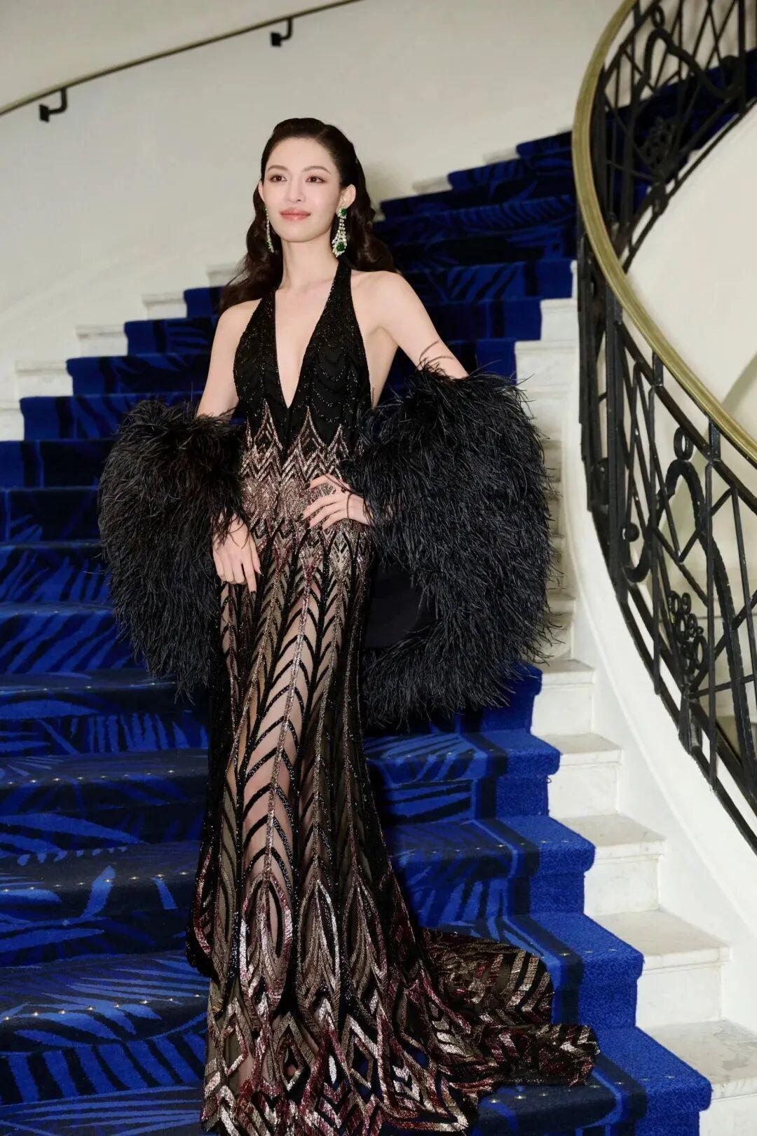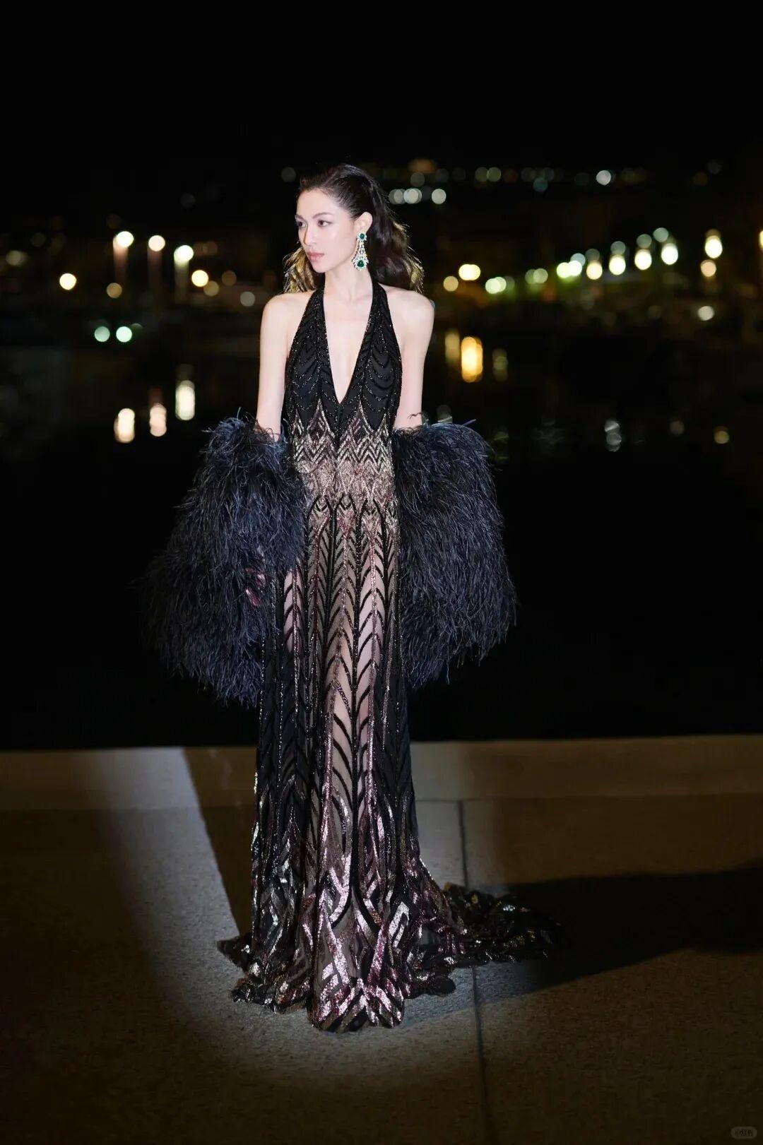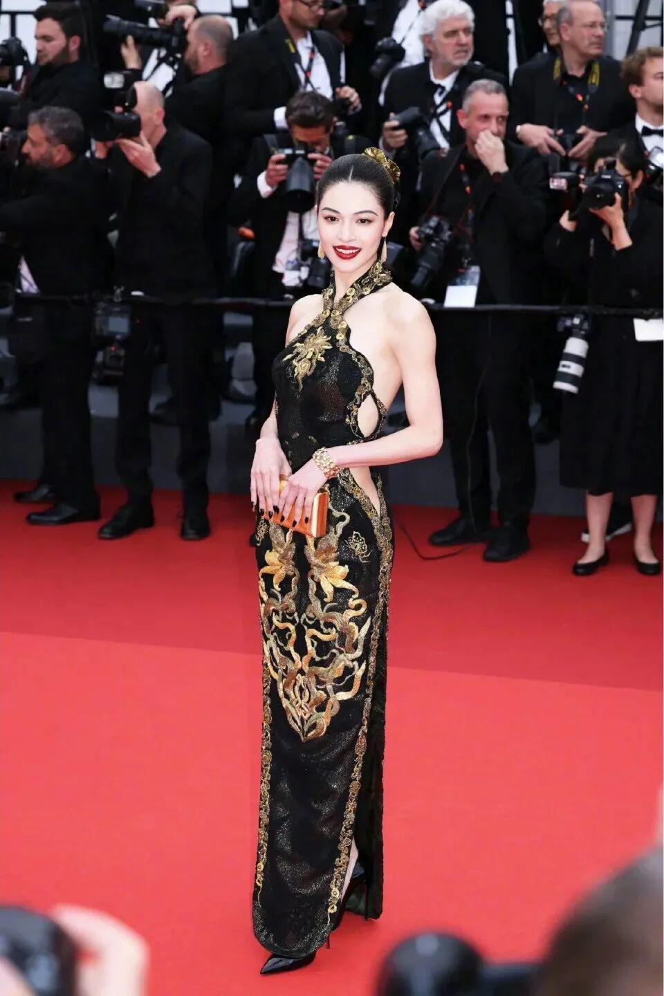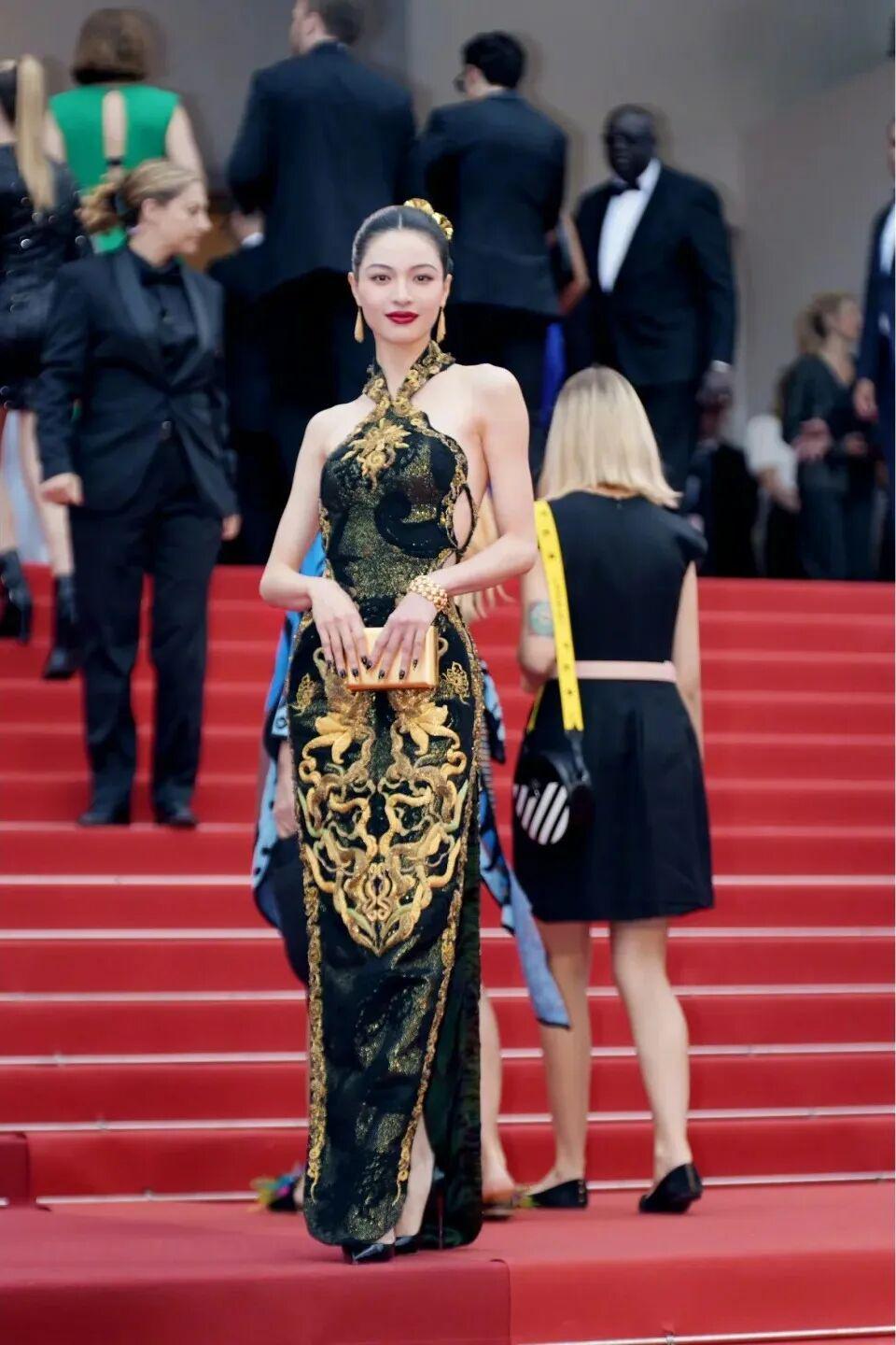 2023年,第一次登上戛纳红毯的她上身LAURENCE XU 2013黑金礼裙镂空旗袍礼服,露肤度极高的礼服让好身材一览无遗,身上的龙纹也融合了国风元素,是一次大胆的尝试。