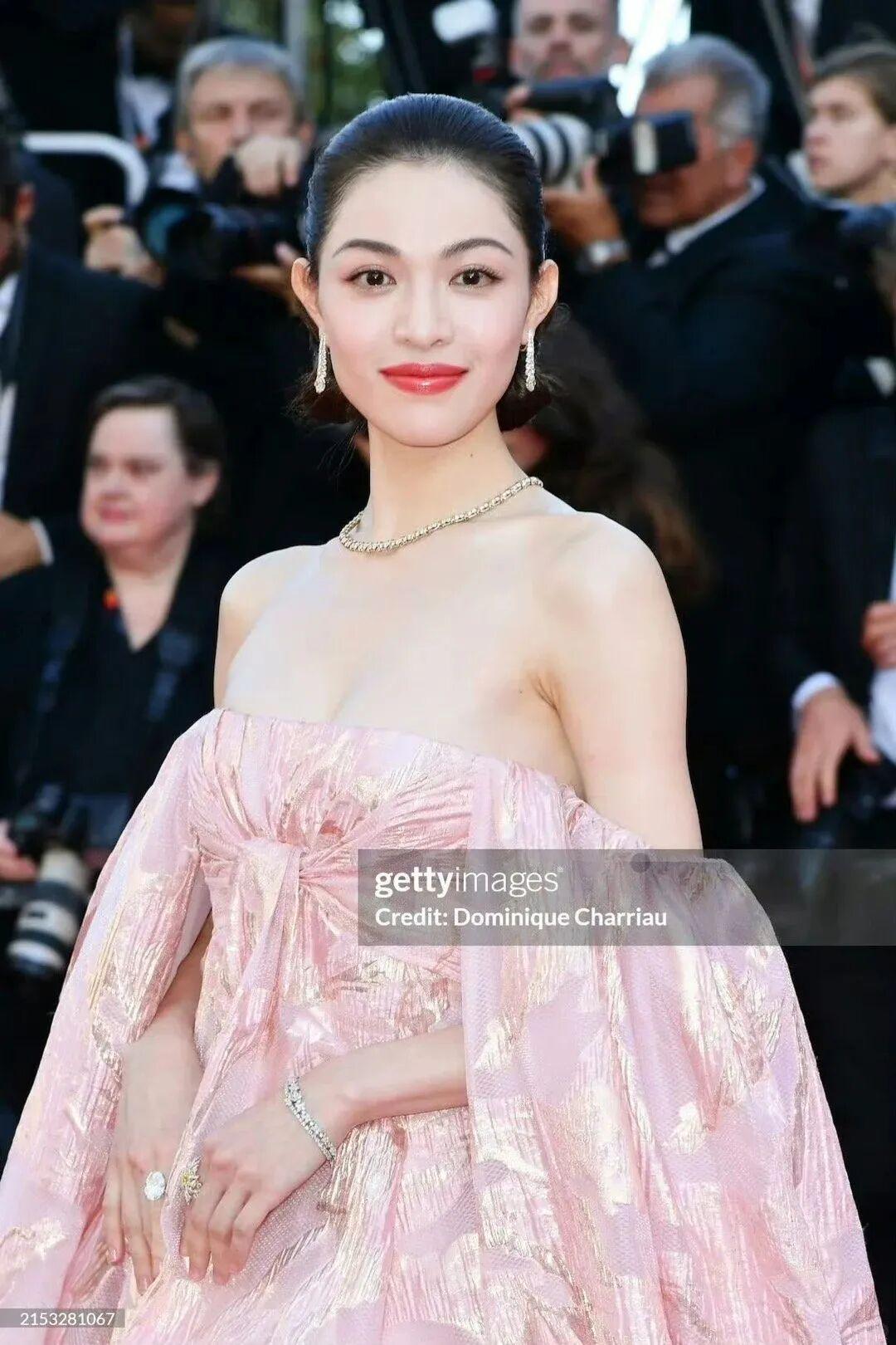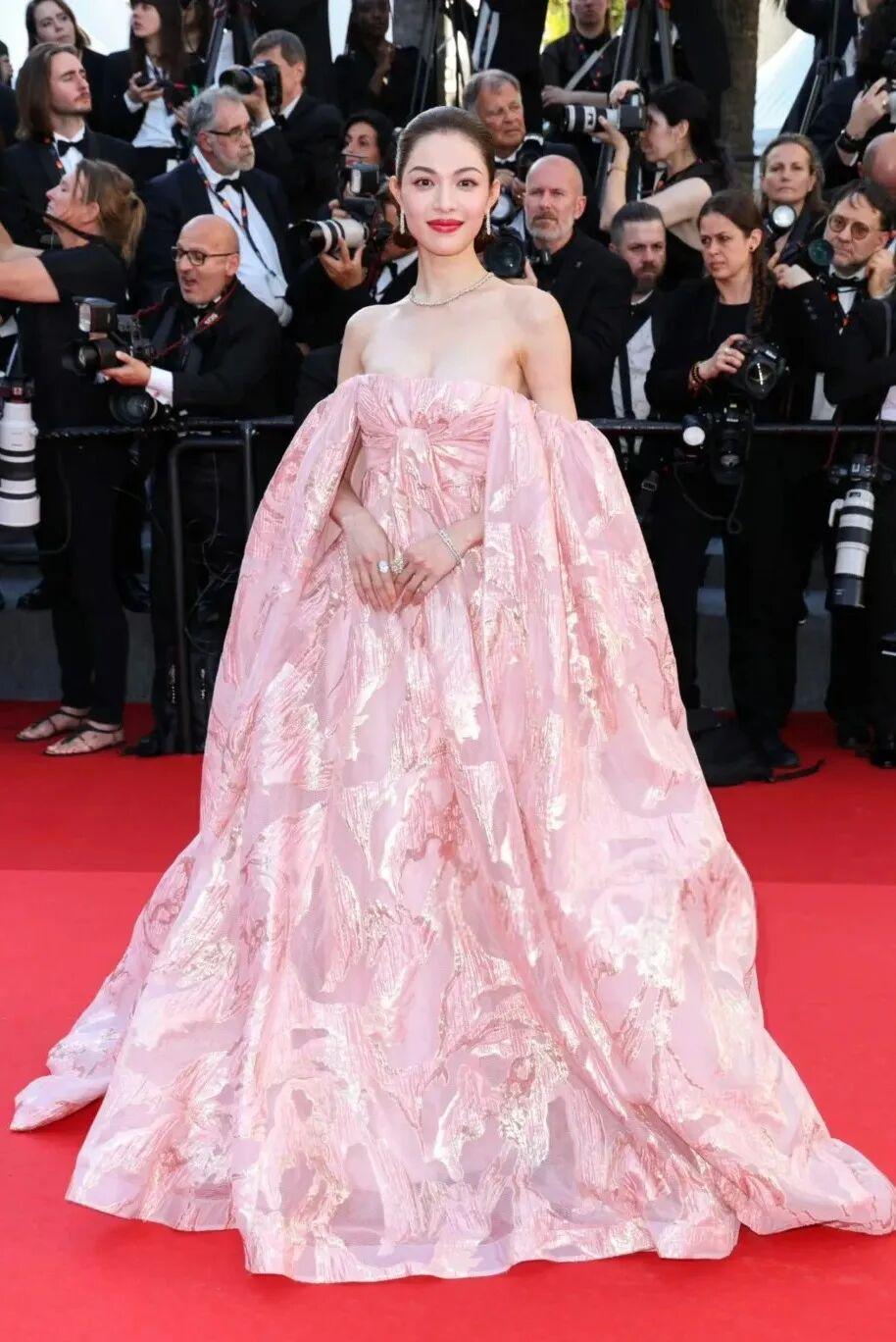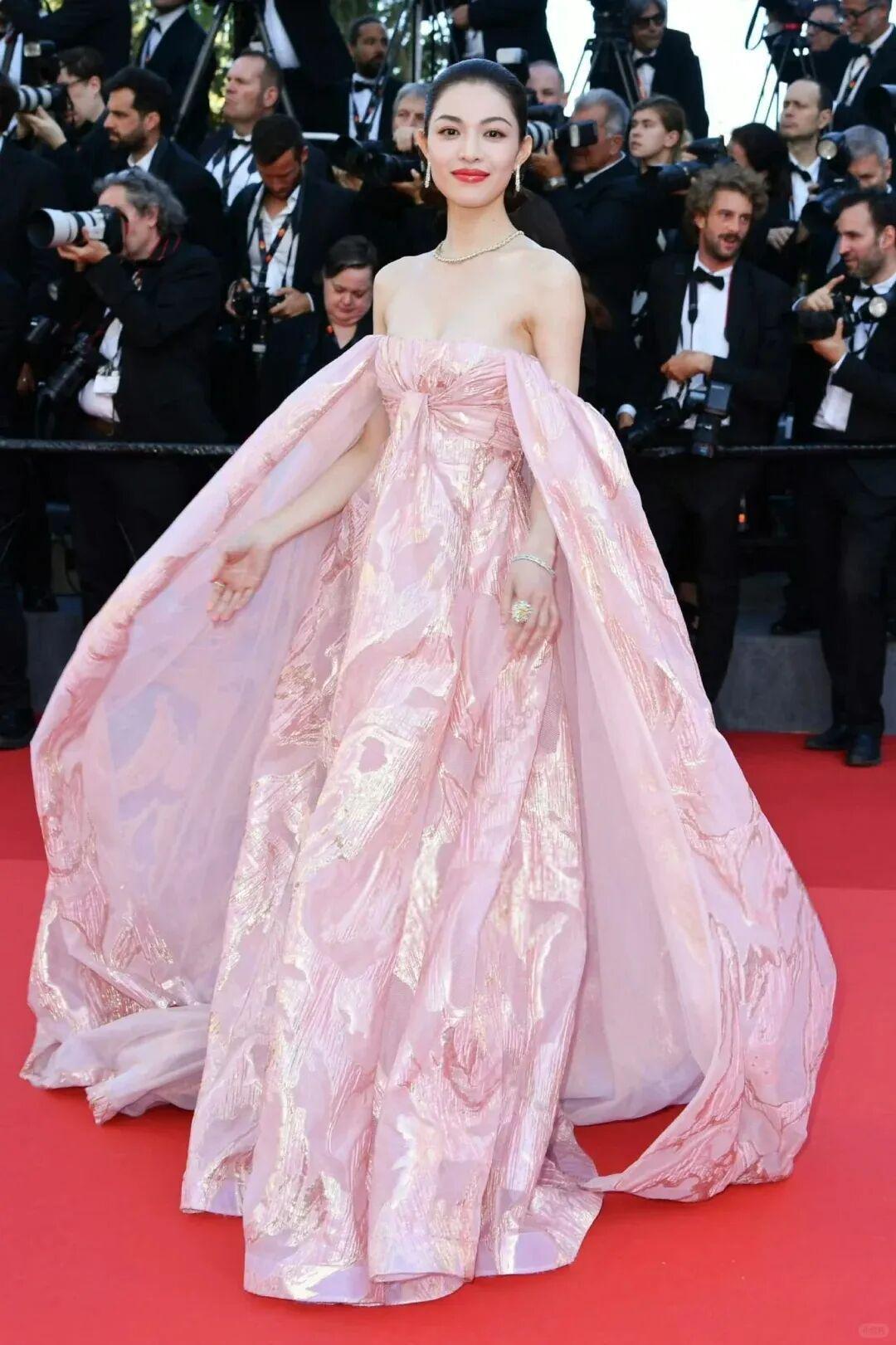 去年,二战戛纳的钟楚曦打出了“保守牌”,选择Valentin Yudashkin 2024春夏定制系列的粉色抹胸波纹礼裙,大体积的礼服虽然足够吸睛,但整体甜美的风格也只能算是无功无过。