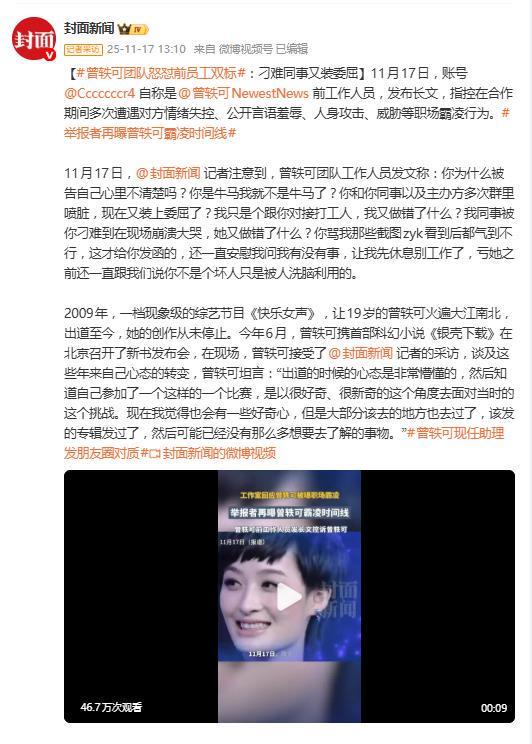 11月17日,一场围绕歌手曾轶可的职场纠纷在社交平台上迅速发酵,引发了广泛关注和热议。一名自称是曾轶可前工作人员的账号@Cccccccr4发布长文,控诉在合作期间遭遇一系列职场霸凌行为,相关话题“#举报者再曝曾轶可霸凌时间线#”迅速登上热搜榜。然而,事件很快迎来反转——曾轶可团队工作人员直接发文回呛:“你为什么被告自己心里不清楚吗?”并揭露前员工存在“喷脏”“刁难同事”等不当行为,让这场“职场罗生门”彻底陷入混战。