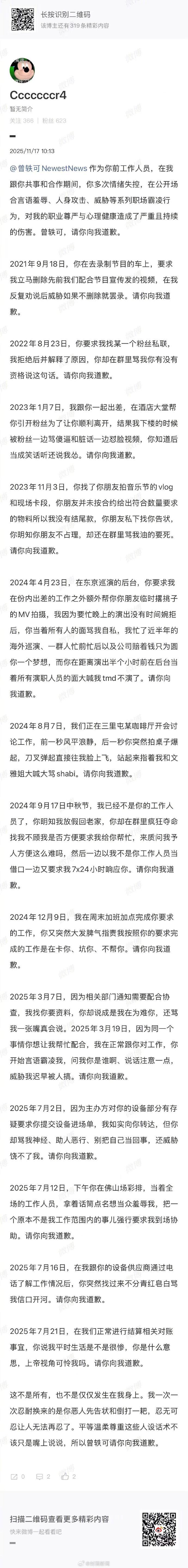 这篇控诉长文细节惊人,前员工在文中指控曾轶可多次情绪失控。例如,在2024年东京巡演后台,因拒绝额外工作被骂“自私”并遭到威胁罢演;同年8月在三里屯咖啡厅争执时,拍桌导致刀叉飞向员工面部。更令人震惊的是,前员工还提及2022年因拒绝私联特定粉丝,在群内遭到辱骂“没资格说话”,甚至在离职后仍被要求7×24小时响应工作,中秋佳节还被质问“予人方便这么难吗”。长文每段结尾都强硬要求曾轶可道歉,态度十分鲜明。