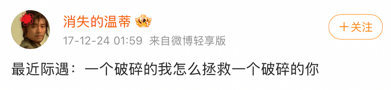 这是谭晓虹的微博。非常标准的文艺青年:“一个破碎的我怎么拯救一个破碎的你”。