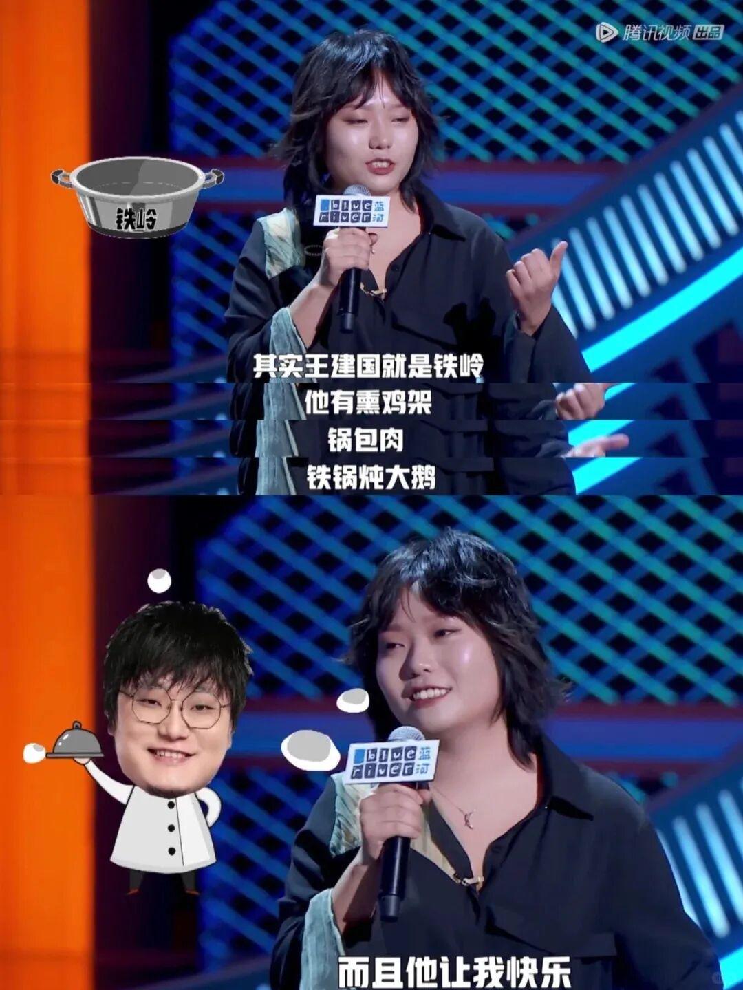 李雪琴是个聪明人,既然cp已经炒起来了,导演组也有意愿利用好这个话题,她就使出十分的力气投入进去,在很多比赛环节主动提起王建国,每次她提起王建国,现场都炸成一片: