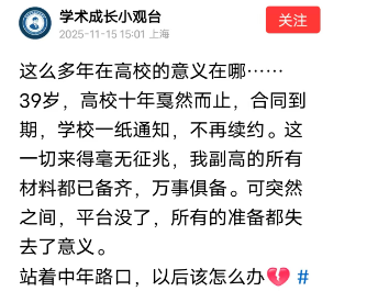 近日,一则令人唏嘘的消息在网络上引发了广泛讨论:一位39岁的高校教师,在高校工作十年,副高职称的所有材料都已准备齐全,却因合同到期被学校一纸通知不再续约。这一切来得毫无征兆,让这位教师站在了中年的十字路口,不禁发问:这么多年在高校的意义在哪?
