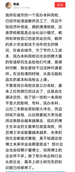 其实,这两年高校教师被辞退的情况并不鲜见。有网友透露,自己所在城市的一所民办本科院校已经开始清退教师员工,且不给经济补偿金,搞得沸沸扬扬。这类学校采用企业化运行模式,教师与学校签订的是劳动合同,教师的数量完全取决于当年的招生情况。一旦招生不理想,教师岗位就可能面临缩减。