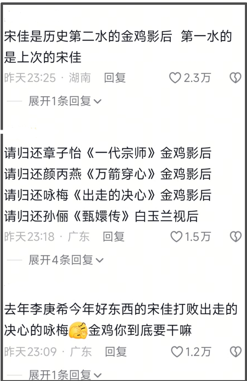 怀揣着愤愤不平的心情,激动的网友们纷纷涌向各大官方账号的评论区,表达自己的不满和质疑。首当其冲的自然是电影频道官方账号,在其恭喜宋佳二封金鸡奖最佳女主角的动态下,评论区迅速被质疑声淹没。第一条评论便直言金鸡奖太水,认为同台竞技的女演员中有更优秀的,但奖项却偏偏给了表现略逊一筹的宋佳。此外,前排评论中,多数网友都在为咏梅鸣不平,直言宋佳的表演无法与咏梅相提并论。