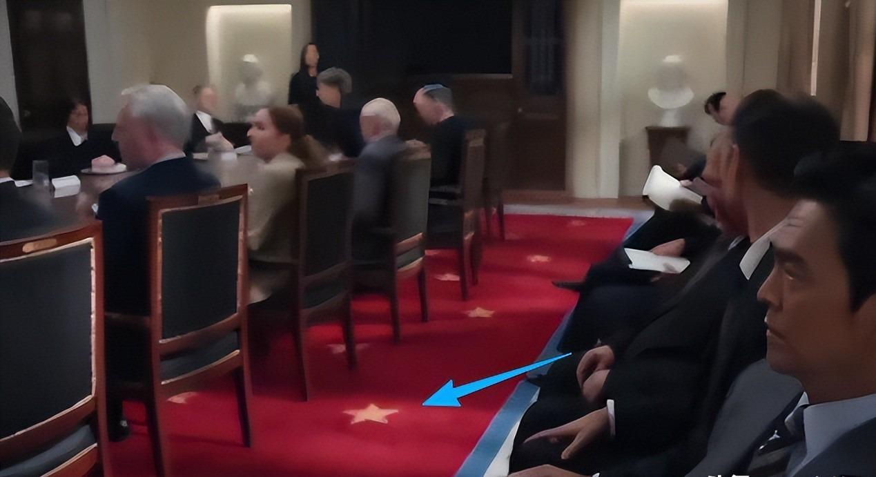 还有会议室里铺设的带有五角星的红色地毯,这与中国国旗的核心元素高度一致,却被拍摄人员随意踩踏。
