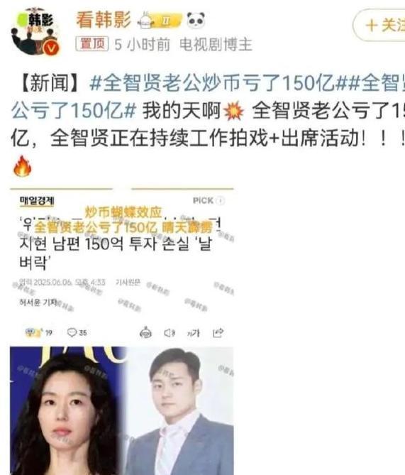据韩媒报道,全智贤此次复出是因为她丈夫崔俊赫投资亏损了150亿韩元,她本想通过《暴风圈》每集4亿韩币的片酬来提升自己的商业价值,然后再靠代言来偿还债务。