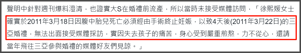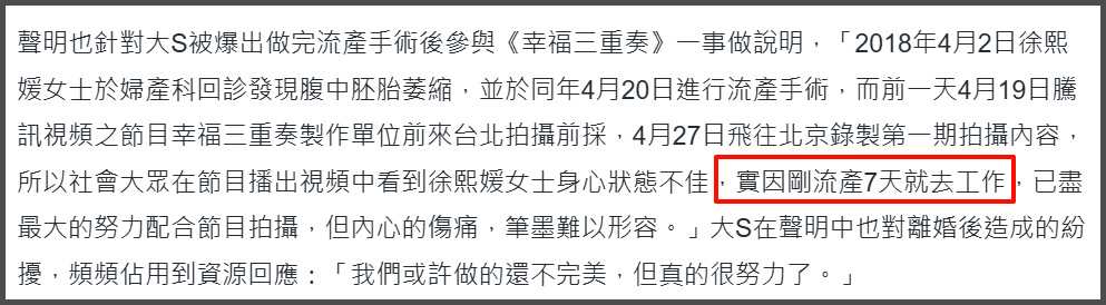 后来大S刚生完二胎一年,身材还没恢复过来,就现身汪小菲的酒店帮忙剪彩。当时大S胖得台媒都以为她怀了第三胎,一向在意身材的大S也遭到了不少吐槽。再后来大S又怀上三胎,但因为身体不好所以引起了不少人的担心。随后大S和汪小菲录制了综艺《幸福三重奏》,网友才知道大S录综艺前刚流产了,休息了7天后就跑去北京开启了正式的节目录制。而大S在节目上怕冷怕吹风,就是因为高龄怀孕又流产的影响。
