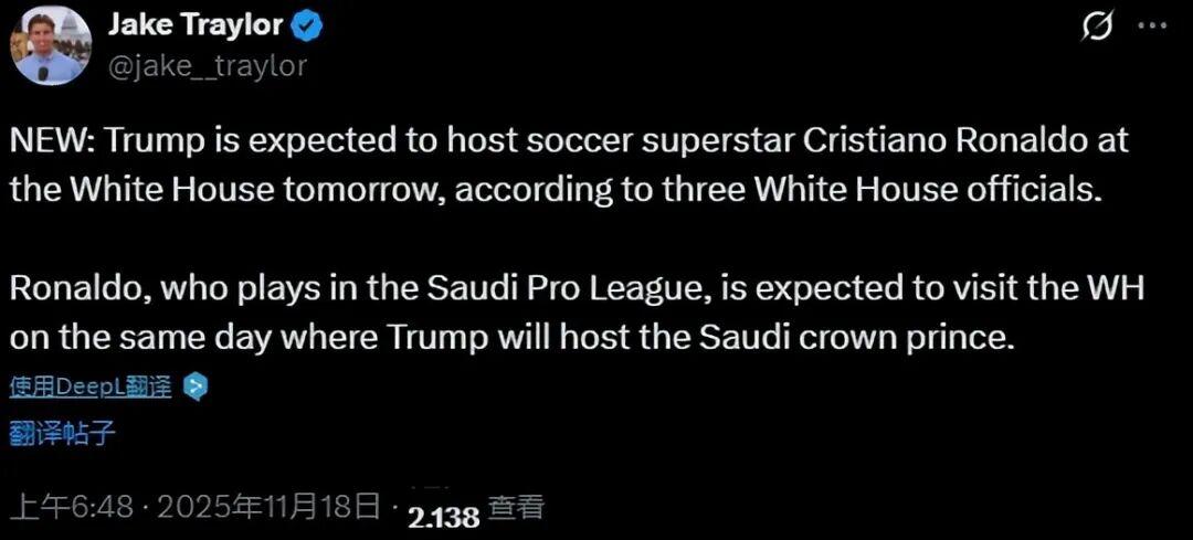 有趣的是,就在这一发言不久后,C罗竟真的要与特朗普展开联动了!据白宫记者杰克·泰勒透露,特朗普将在总统府邸正式会见这位葡萄牙巨星,同时沙特方面也将安排高管陪同。据悉,此次C罗的行程中,沙特王储也会与美国方面进行官方会见,这也是此次行程的主要目的之一。