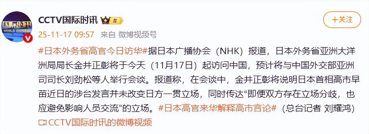 2025 年 11 月 17 日,在日本首相高市早苗涉华不当言论持续发酵之际,日本外务省亚洲大洋洲局局长金井正彰紧急访华。与其说是访问,不如说是一场十万火急的“灭火行动”。