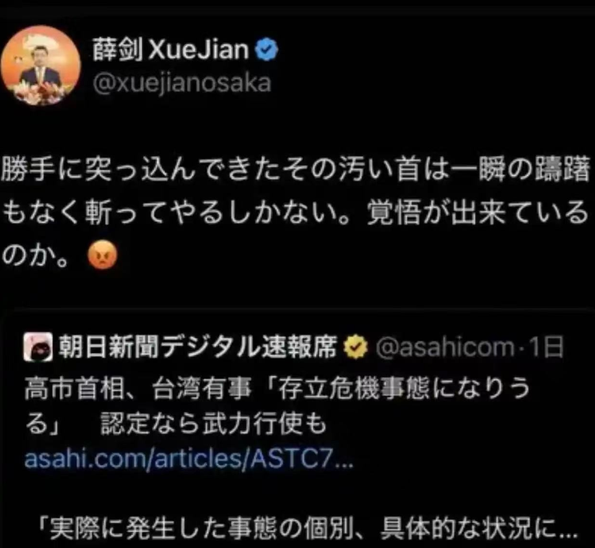 就在高市早苗抛出谬论的第二天,11月8日,这位身处对日外交一线的中国总领事,在社交媒体X上用日语发表了一篇战斗檄文。文中一句“勝手に突っ込んできたその汚い首は...”,被日本媒体解读为要“斩脖子”,瞬间在日本舆论场掀起轩然大波。