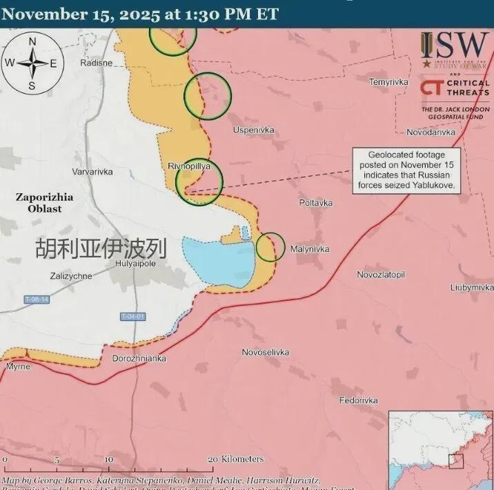 在扎波罗热州,俄军占领亚布卢科夫后从东面逼近韦塞莱,乌军通过炸毁桥梁延缓其推进。新巴甫洛夫卡战场上,俄军利用大雾架设浮桥运送约十辆装备。DeepState机构11月14日证实,俄军攻占第聂伯罗彼得罗夫斯克州新巴甫洛夫卡定居点,但乌军第42旅随即发起反击,增援部队正在赶往该区域。
