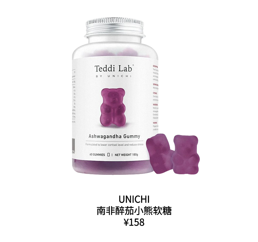南非醉茄又被称为“印度人参”,主要功能就是平衡皮质醇水平,有助于减轻压力,帮助体重管理。这款小熊软糖含有高浓度的南非醉茄粉,搭配VD和镁,三效合一,0糖低脂,好吃无负担。