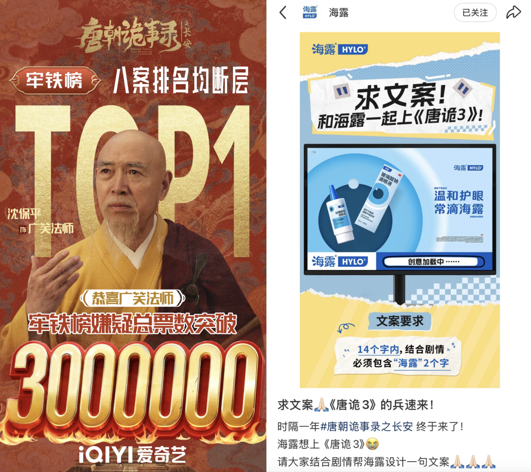 《唐诡3》开播前就有超300万"诡友"预约,开播即爆,更带动前作热度回升,三部曲包揽爱奇艺飙升榜前三。这种跨季延续的IP热度,让品牌投放不局限于单季剧集周期,而是可借助IP长尾效应实现持续曝光。