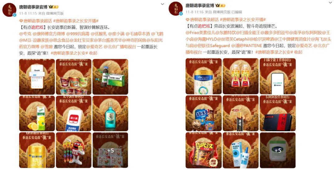 依托诡友的“高价值”特质,《唐诡3》成功吸引了40余家跨领域品牌,覆盖了从食饮、美妆到高端酒类等多元消费市场。