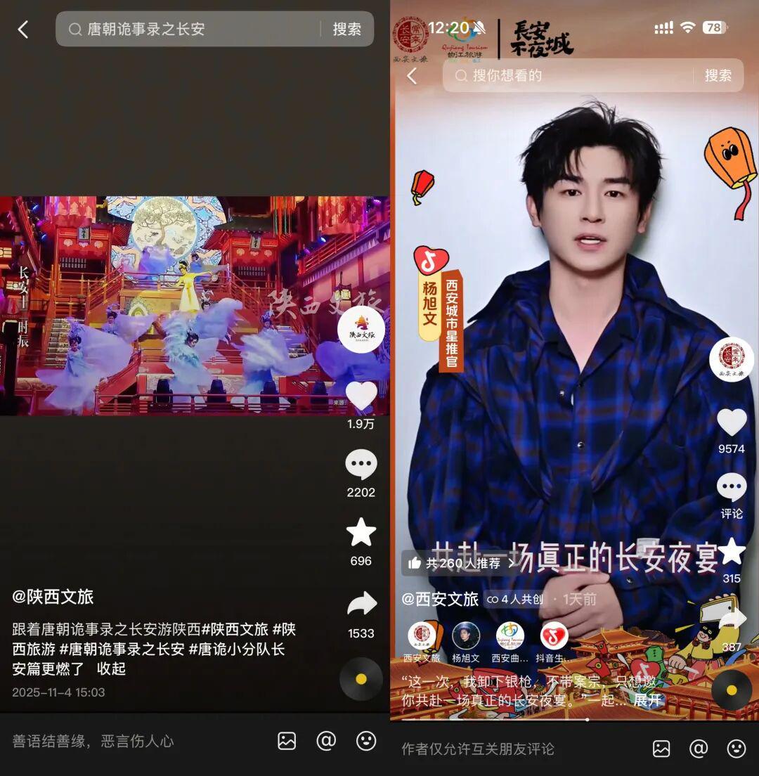 《唐诡3》中,盛世大唐的恢弘气象、太平公主与上官婉儿的深厚友情,跨越时空直抵诡友内心;剧中终南山、曲江池、长安 108 坊等唐诡小分队足迹所至的场景,均能在西安实地体验。陕西文旅顺势与《唐诡 3》深度联动,不仅推出贴合剧情的 “跟着唐朝诡事录之长安游陕西”的文旅种草视频,结合剧集内容科普陕西历史文物,更邀请卢凌风饰演者杨旭文担任“西安城市星推官”,全方位助力诡友探寻盛世长安的烟火真相。