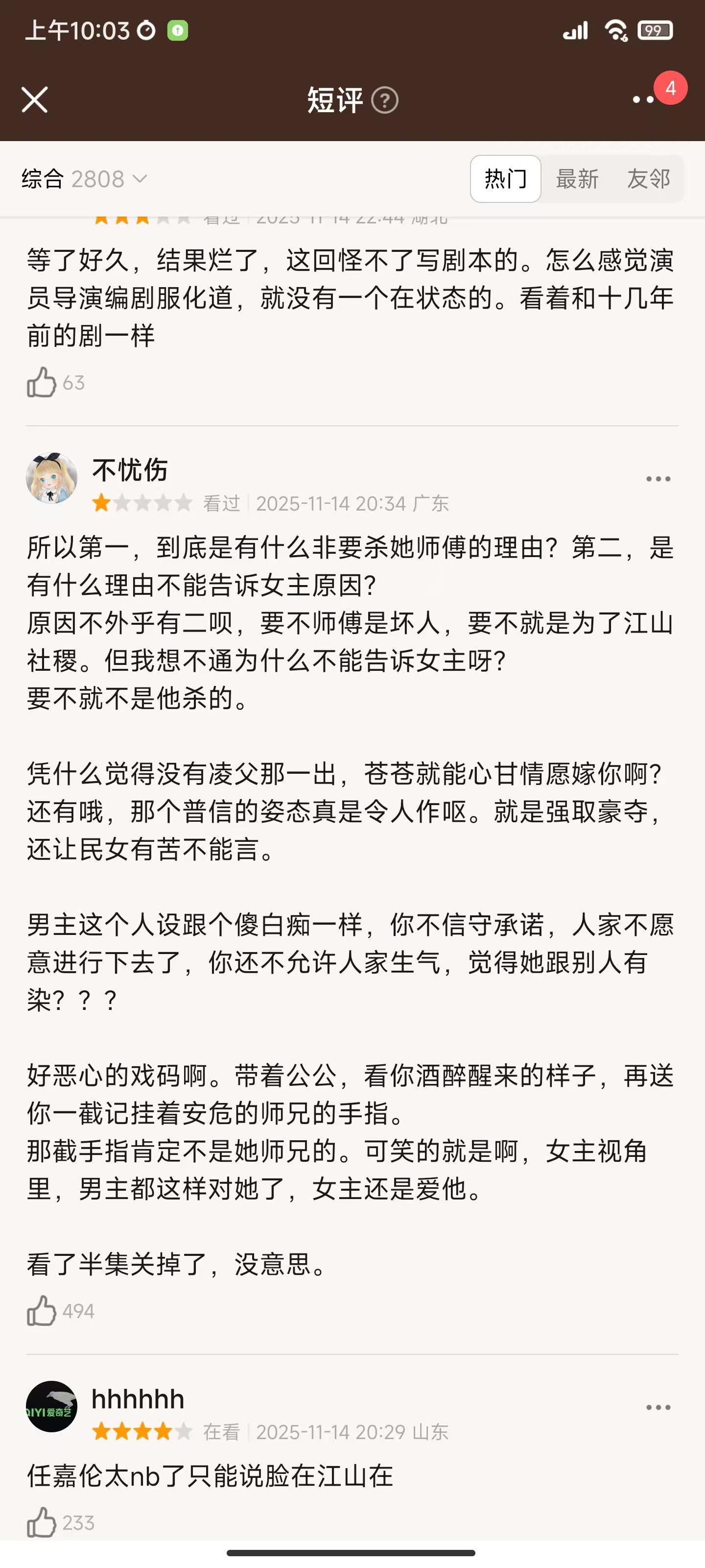 首播口碑呈现两极分化:粉丝盛赞其为"虐恋天花板",认为任嘉伦与彭小苒这对"BE专业户"的组合极具化学反应,狗血剧情成功拉动观众情绪。但普通观众则批评剧情老套,指出"长嘴不说"的误会套路、男主隐瞒身份的动机不明、强娶桥段涉嫌欺压民女等硬伤。更引发争议的是,剧中竟出现女主醉酒后收到竹马手指的惊悚情节,被指"反派设定过于明显"。