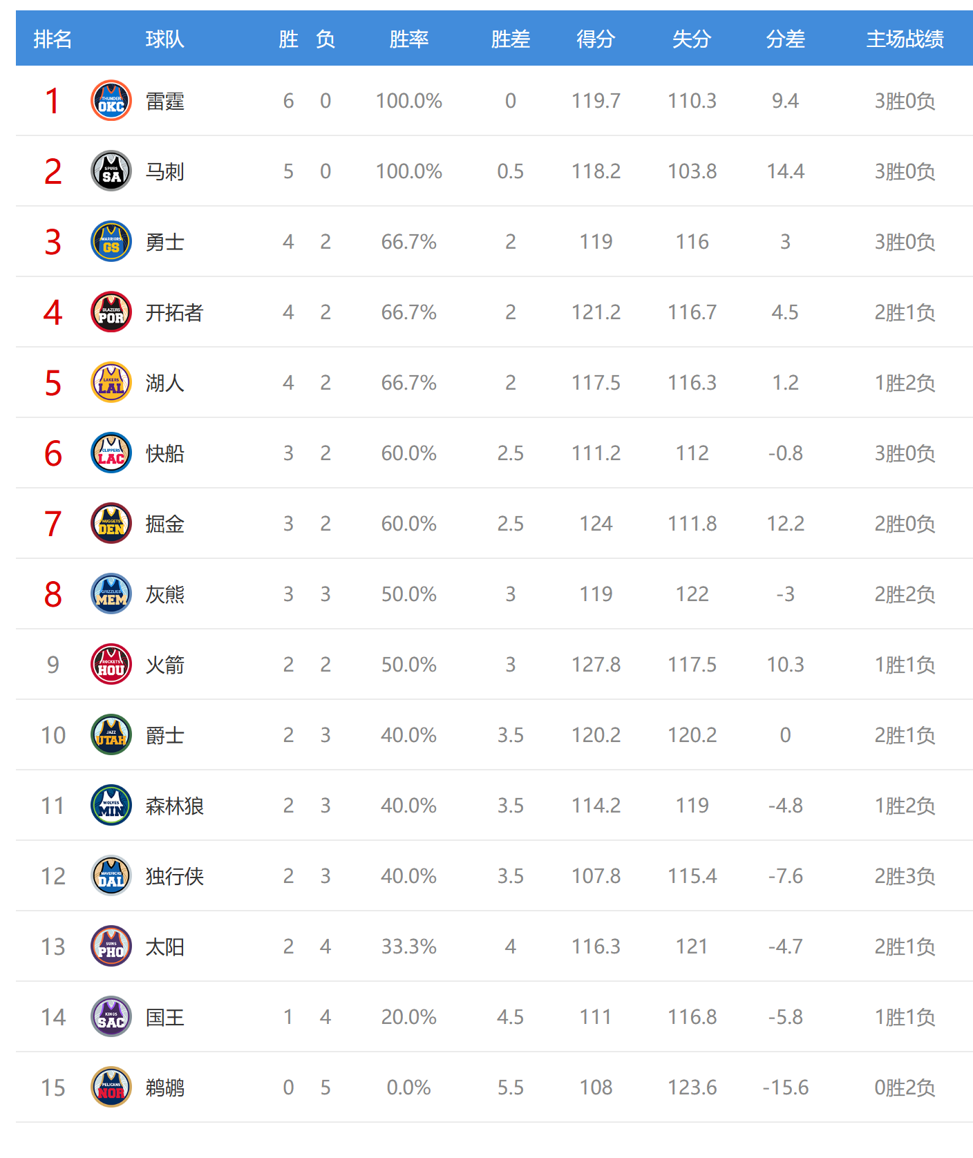 随着赛季深入,西部竞争愈发白热化。目前仅森林狼(5胜1负)和雷霆(5胜1负)稳居前二,第三至第十名之间最大差距仅1.5个胜场。这种群雄逐鹿的态势,预示着西部季后赛席位争夺将异常惨烈。