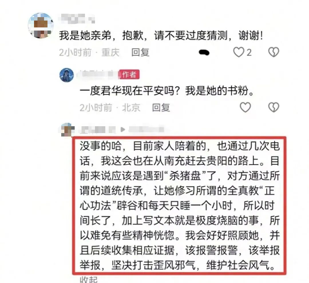 13日,《星落凝成糖》作者一度君华发文求救,称有人以高频电磁波对她进行骚扰,逼她写下遗书,一天只允许睡一小时。14日晚,晋江回应星落凝成糖作者求救称已联系其家人。也有网友发现一度君华弟弟报平安,透露姐姐目前家人陪着,应该是遇到“杀猪盘”,后续将收集相应证据报警。