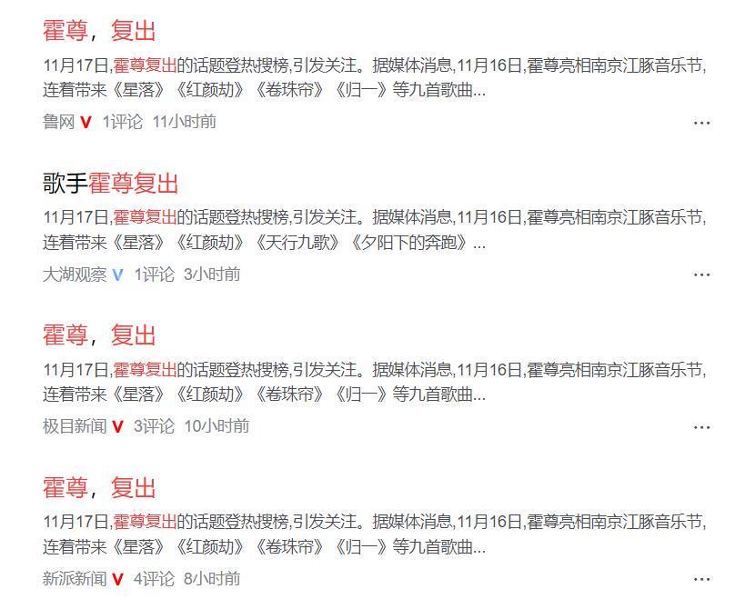 对于这次霍尊亮相大型演出,各大媒体纷纷以“霍尊复出”为标题进行了报道。