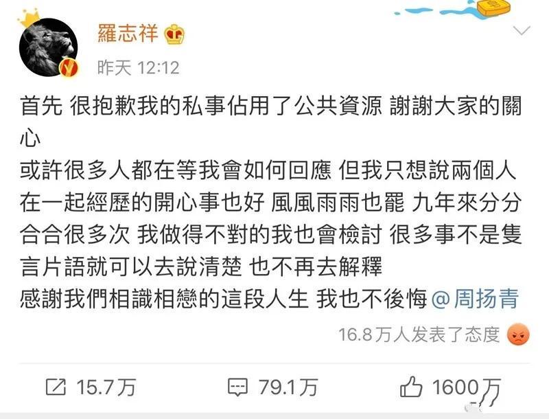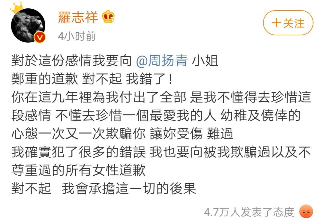 但一天后,他再次发文,这次发文他向周扬青道歉,并承认自己犯了很多错误,“我也要向被我欺骗过以及不尊重过的所有女性道歉,对不起,我会承担这一切的后果。”