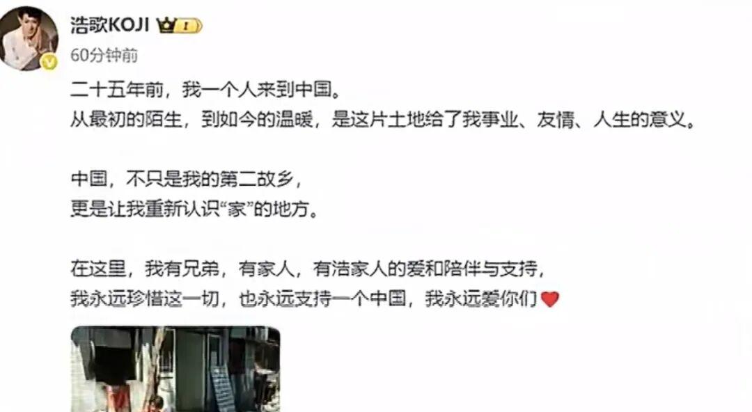 11月18日,日本演员矢野浩二发文:二十五年前,我一个人来到中国。从最初的陌生,到如今的温暖,是这片土地给了我事业、友情、人生的意义。中国,不只是我的第二故乡,更是让我重新认识“家”的地方。在这里,我有兄弟,有家人,有浩家人的爱和陪伴与支持,我永远珍惜这一切,也永远支持一个中国,我永远爱你们。