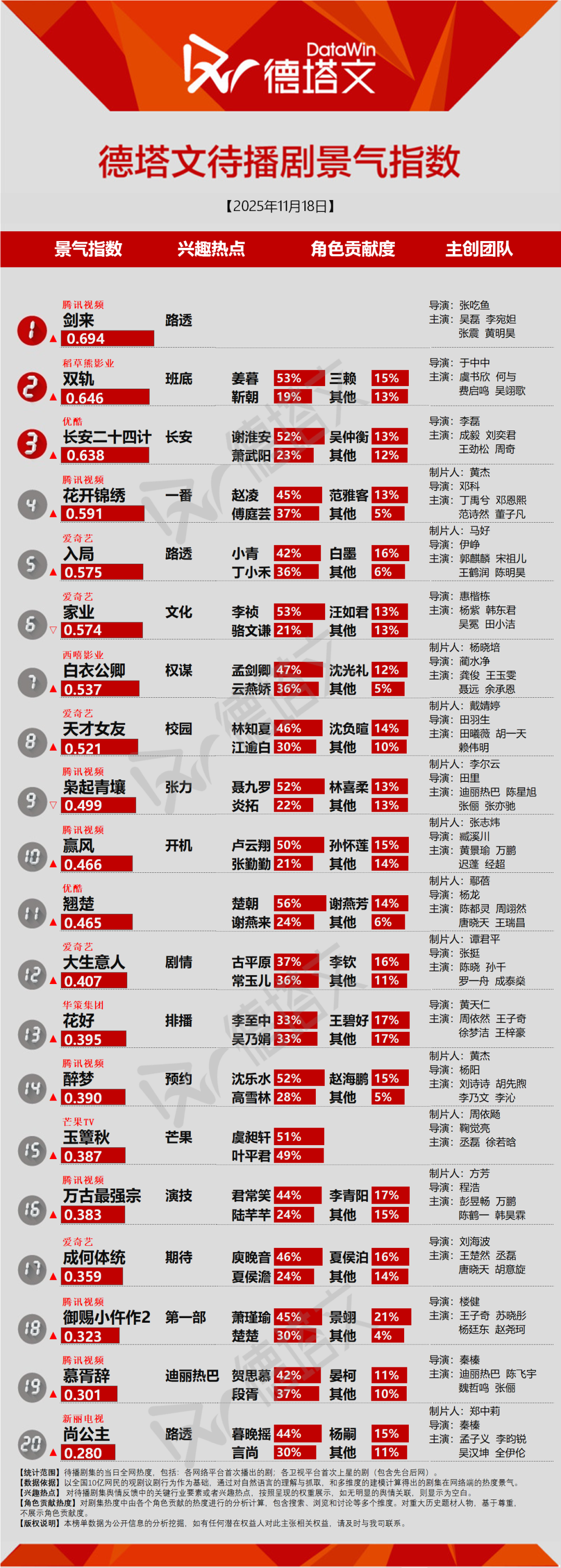 都市情感剧《他为什么依然单身》于11月16日在腾讯视频及东方卫视番茄台开播,首日景气指数为0.596,次日升至1.087,位居平台热度榜前三,显示出初步的圈层吸引力。