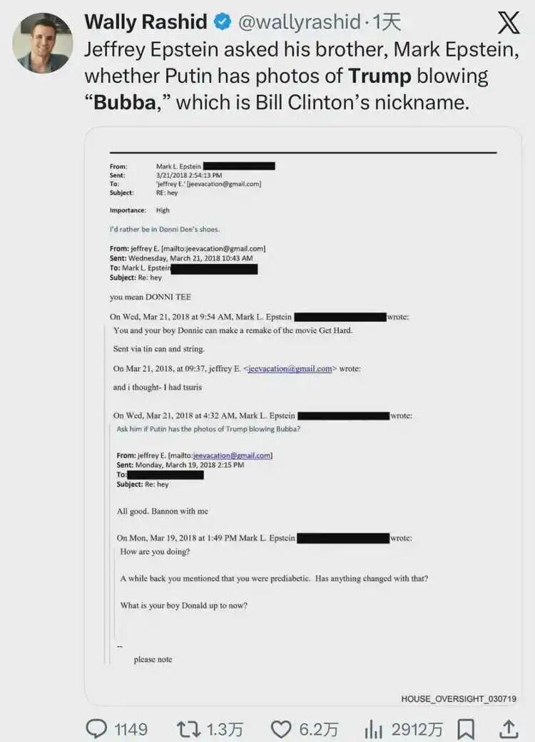 引发全网狂欢的导火索,是一封2018年爱泼斯坦团队成员马克·爱泼斯坦发出的邮件。邮件中写道:“问问他普京是否有特朗普给‘Bubba’吹箫的照片?”这里的“Bubba”正是克林顿的昵称。尽管“吹箫”一词在特定语境下存在歧义,但邮件内容已足够引发无限联想。
