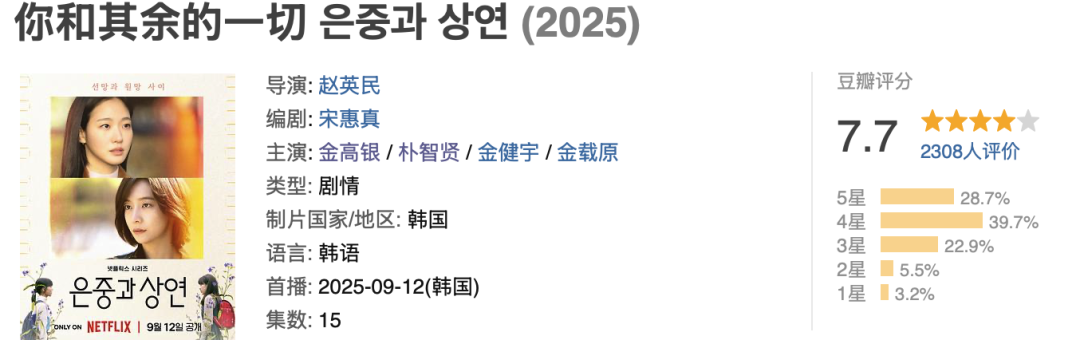 《你与其余的一切》豆瓣评分7.7,大部分差评都在男主角金商壑的选角上,很难接受两大美女抢一个「男主」的设定。
