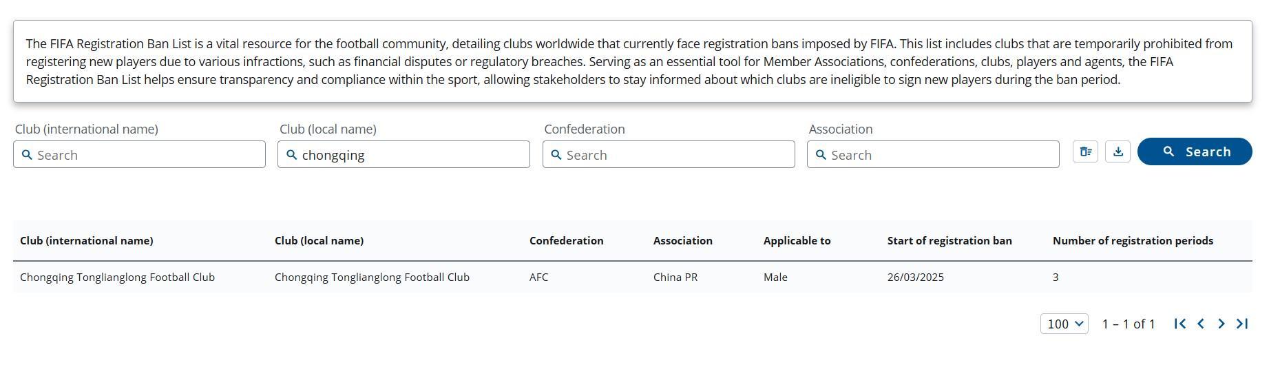 据国际足联转会注册禁令系统显示的信息,重庆铜梁龙在今年3月已经受到了处罚,被禁止在3个转会窗口内注册引进新援。这一禁令无疑对球队的阵容补强和战术调整带来了极大的限制。