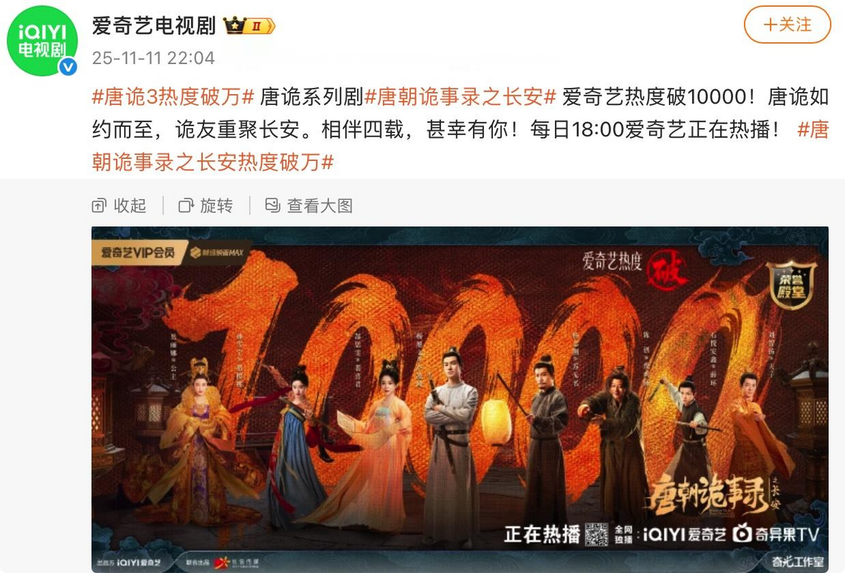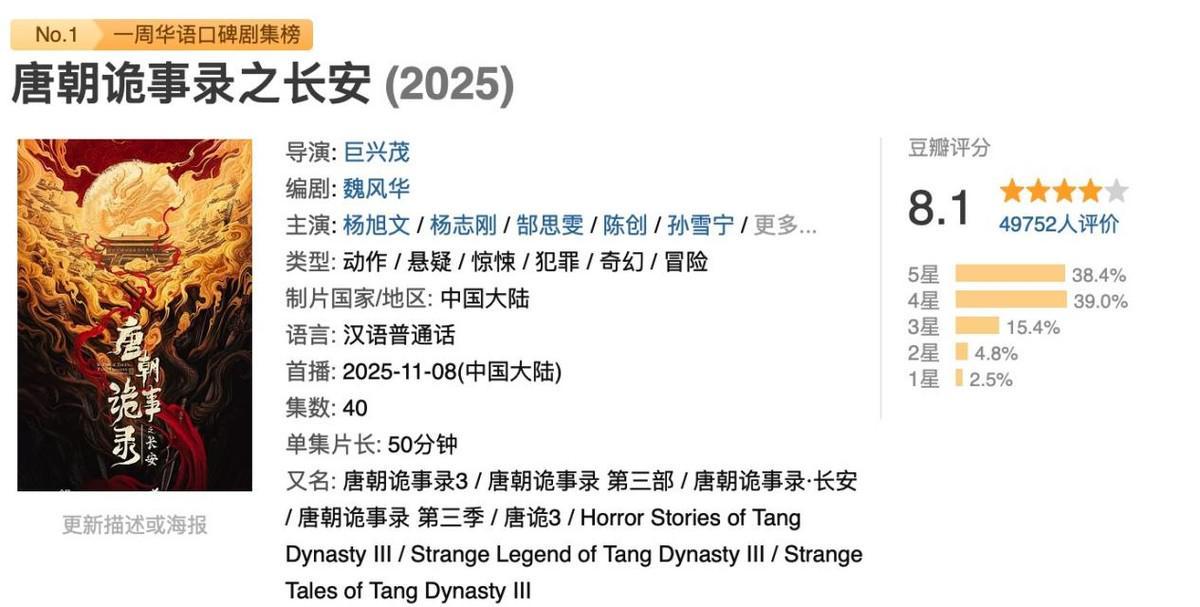 《唐朝诡事录3》上线后再次延续了系列剧“开播即爆”的传统。前四案播完站内热度迅速破万,第五案《旗亭画壁》上线当晚更直接冲上热搜,不到24小时讨论量突破千万。豆瓣开分稳居8.1分,作为国产古装探案剧的第三季,这个成绩足以证明其品质。