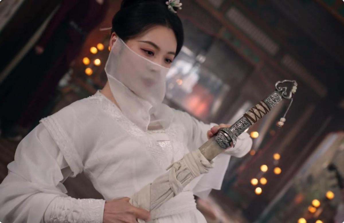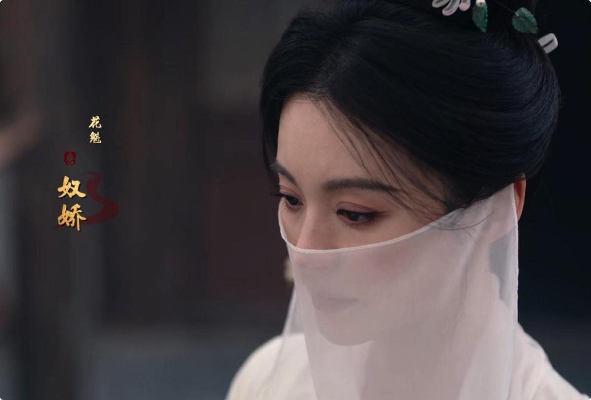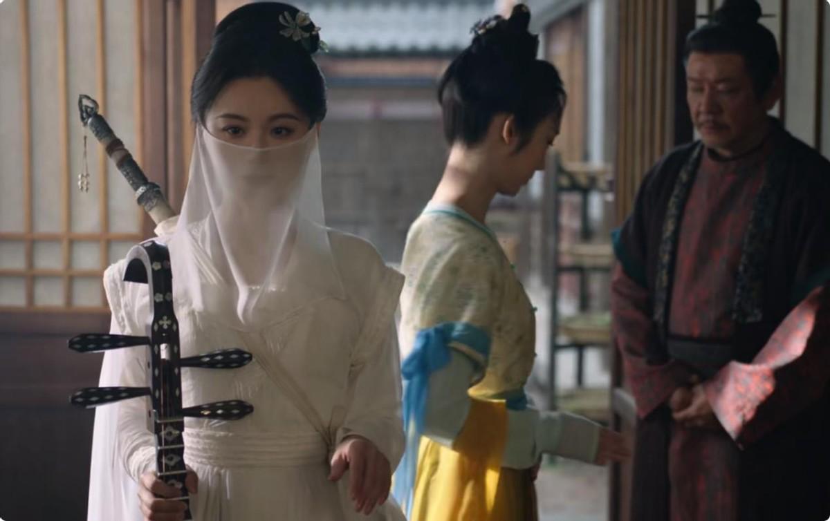 她的初登场堪称惊艳:白衣蒙面抱琵琶的造型,侧影如敦煌飞天般清冷空灵,却又暗藏狐媚。一坐下,喧闹顿止,只剩琵琶声暗涌流动。