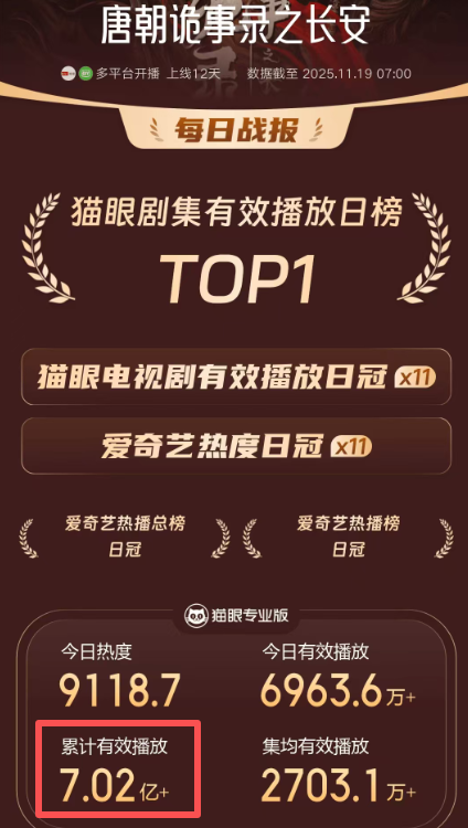 有效播放量突破7亿,连续斩获11个全网播放日冠!