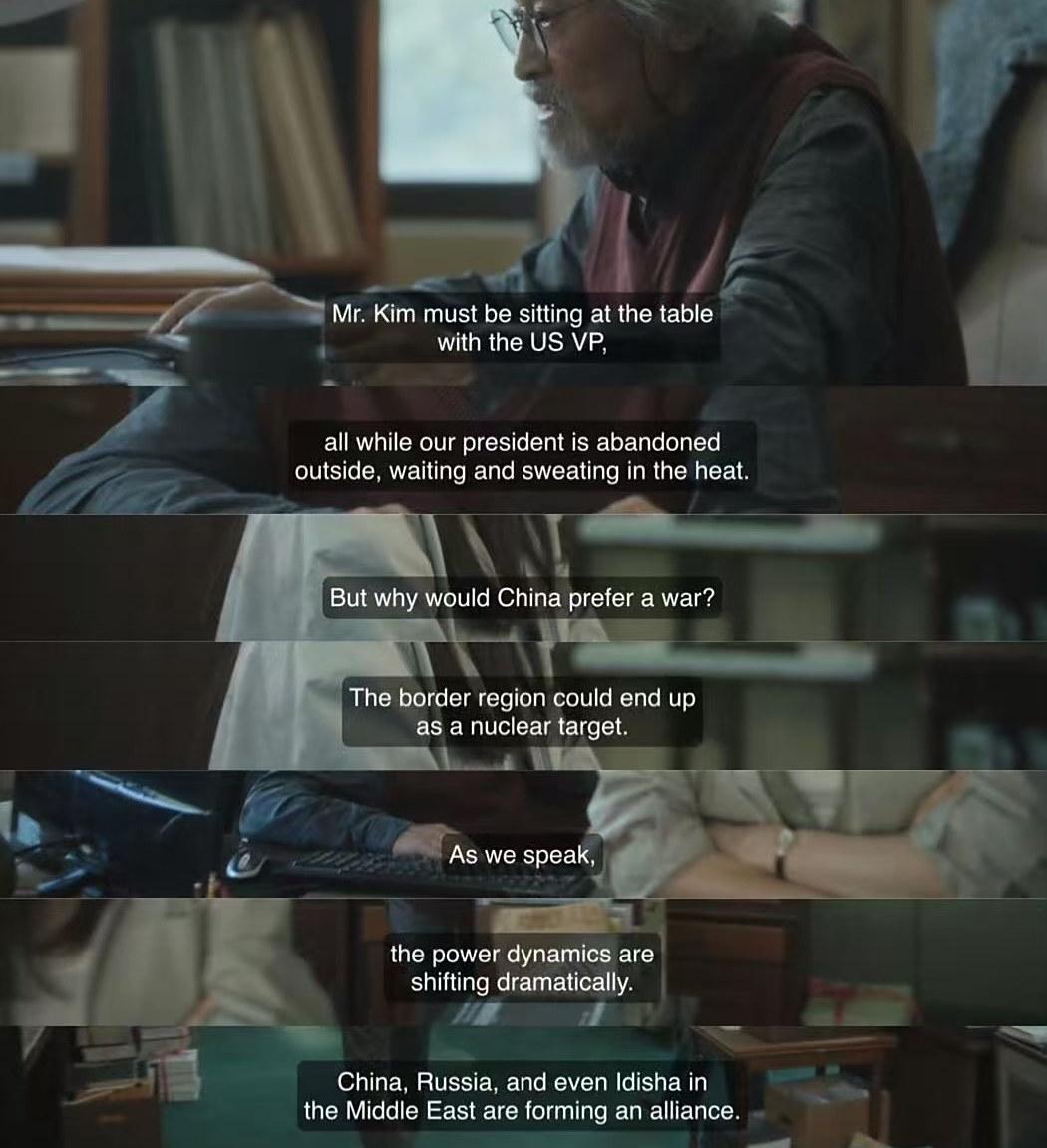 然而,当深入核查剧情背景时,争议的合理性开始动摇。第四集的台词出现在美韩核危机升级的语境下:美国计划打击北韩核设施,南韩总统赴华求援却遭冷遇。剧中人物的不解源于中国对北韩领导人的“优待”与对南韩的“冷落”,进而质疑中国是否意图支持北韩对抗美国。这一逻辑下,台词的核心是角色对局势的误判,而非对中国立场的恶意攻击。