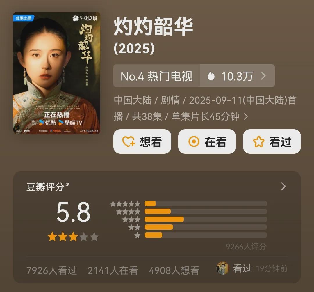 而《灼灼韶华》在播出过程中却争议不断,观众对其剧情的合理性、女主形象的塑造以及演员的表现等方面都提出了诸多质疑,口碑远不及《那年花开月正圆》,目前的豆瓣评分只有5.8分,还不到及格分。