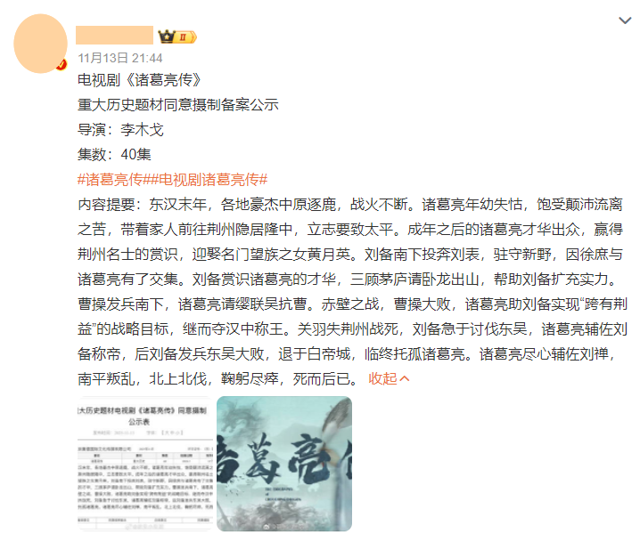 历史题材剧迎来重大动作:电视剧《诸葛亮传》正式启动筹备。